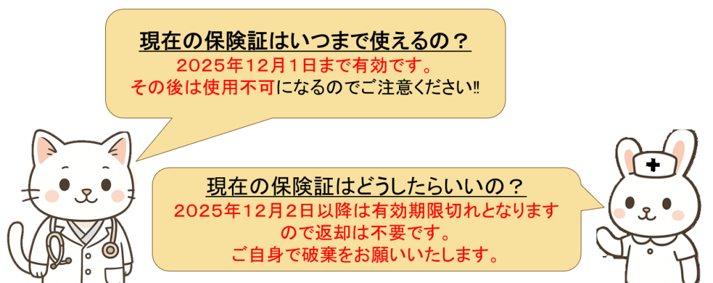 現在の健康保険証は2025年12月2日に完全廃止となり、今後医療機関受診時には基本的にマイナンバーカードを健康保険証として使用する『マイナ保険証』をご利用いただくことになります。